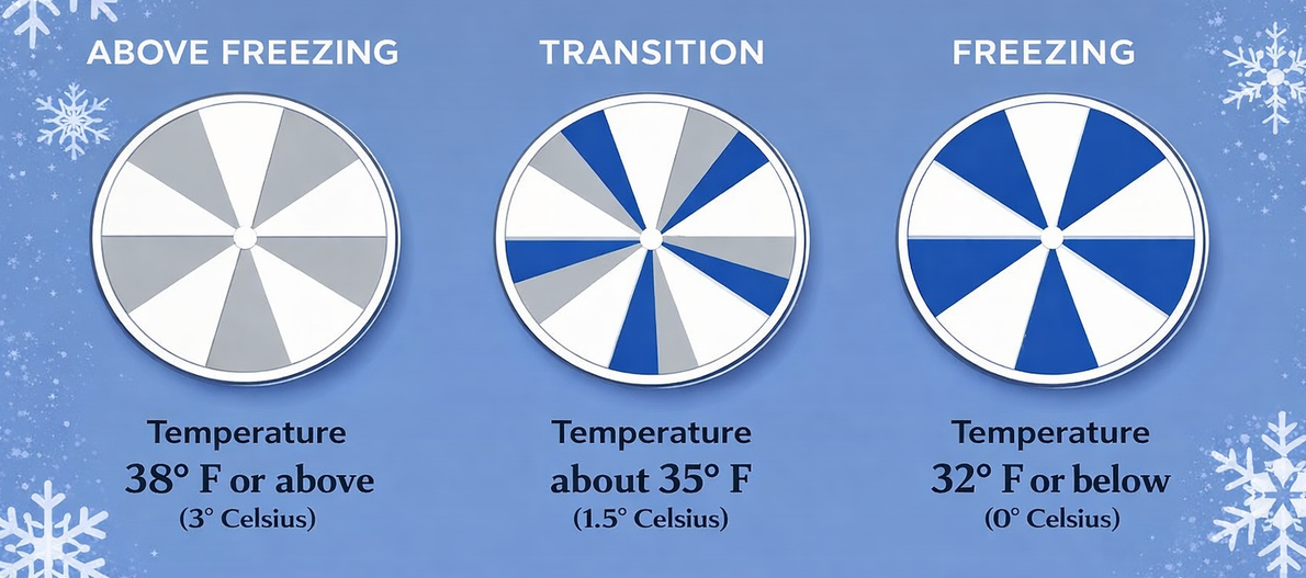The bimetallic indicator mechanically reveals a bright blue warning the moment surfaces approach freezing. Visible from any angle, in any light, day or night.